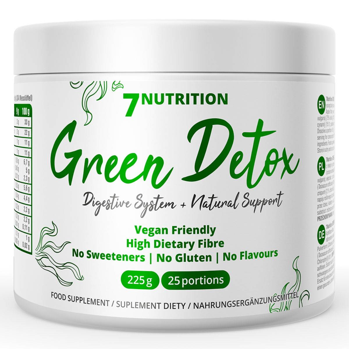 7NUTRITION GREEN DETOX to suplement diety stanowiący staranne zestawienie składników roślinnych i alg, opracowany z myślą o prostym uzupełnieniu codziennego jadłospisu. Jest to rozwiązanie dla osób ceniących jakość komponentów oraz wygodę przygotowania w formie napoju.