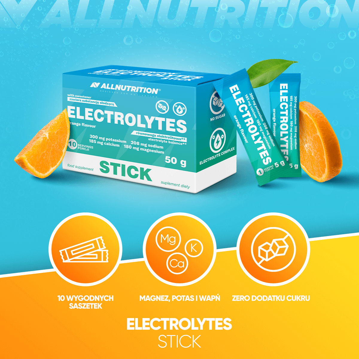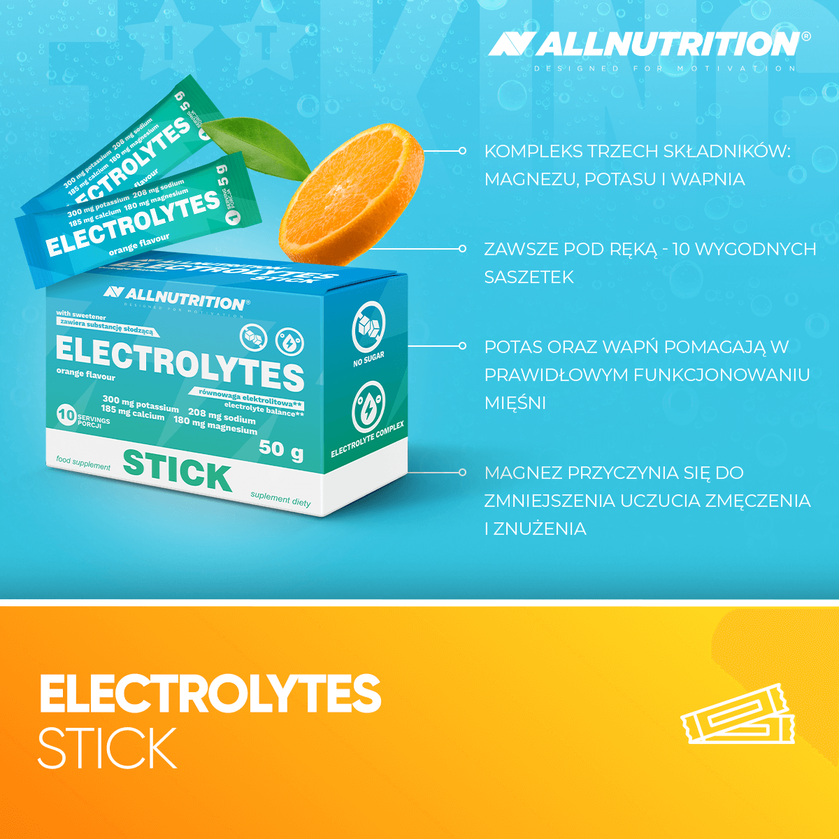 ALLNUTRITION ELECTROLYTES STICK to suplement diety w proszku o orzeźwiającym, pomarańczowym smaku. Każda saszetka została stworzona, aby w prosty i szybki sposób uzupełnić Twoją codzienną dietę w kluczowe składniki mineralne: magnez, potas, sód i wapń.