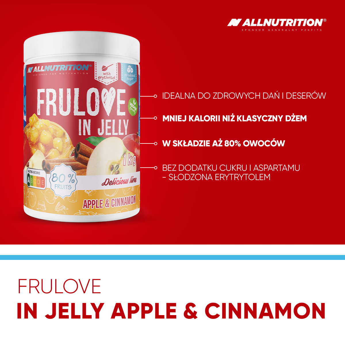 ALLNUTRITION FRULOVE IN JELLY APPLE & CINNAMON to przepyszna frużelina bez dodatku cukru z całymi kawałkami jabłek, aż 80% zawartości owoców! Stworzona z myślą o wszystkich tych, którzy chcą zadbać o sylwetkę, jednocześnie nie rezygnując w swojej diecie z odrobiny słodkiej przyjemności.
