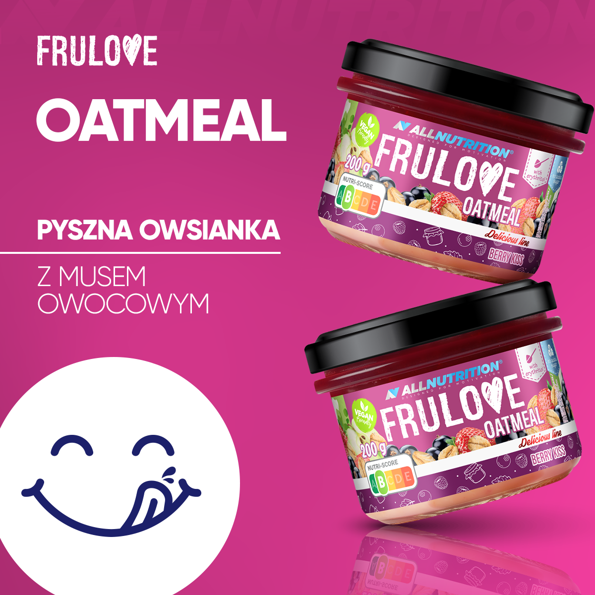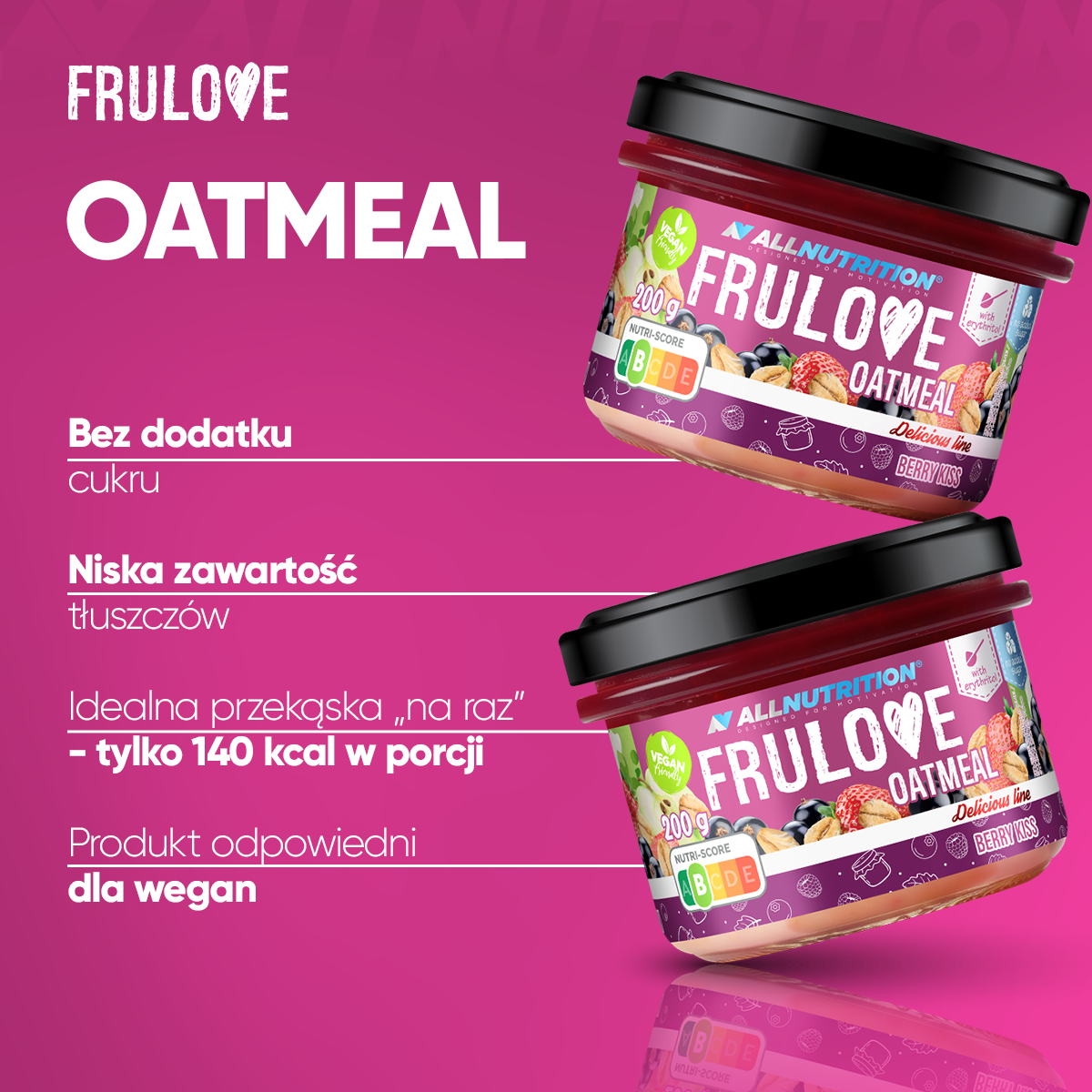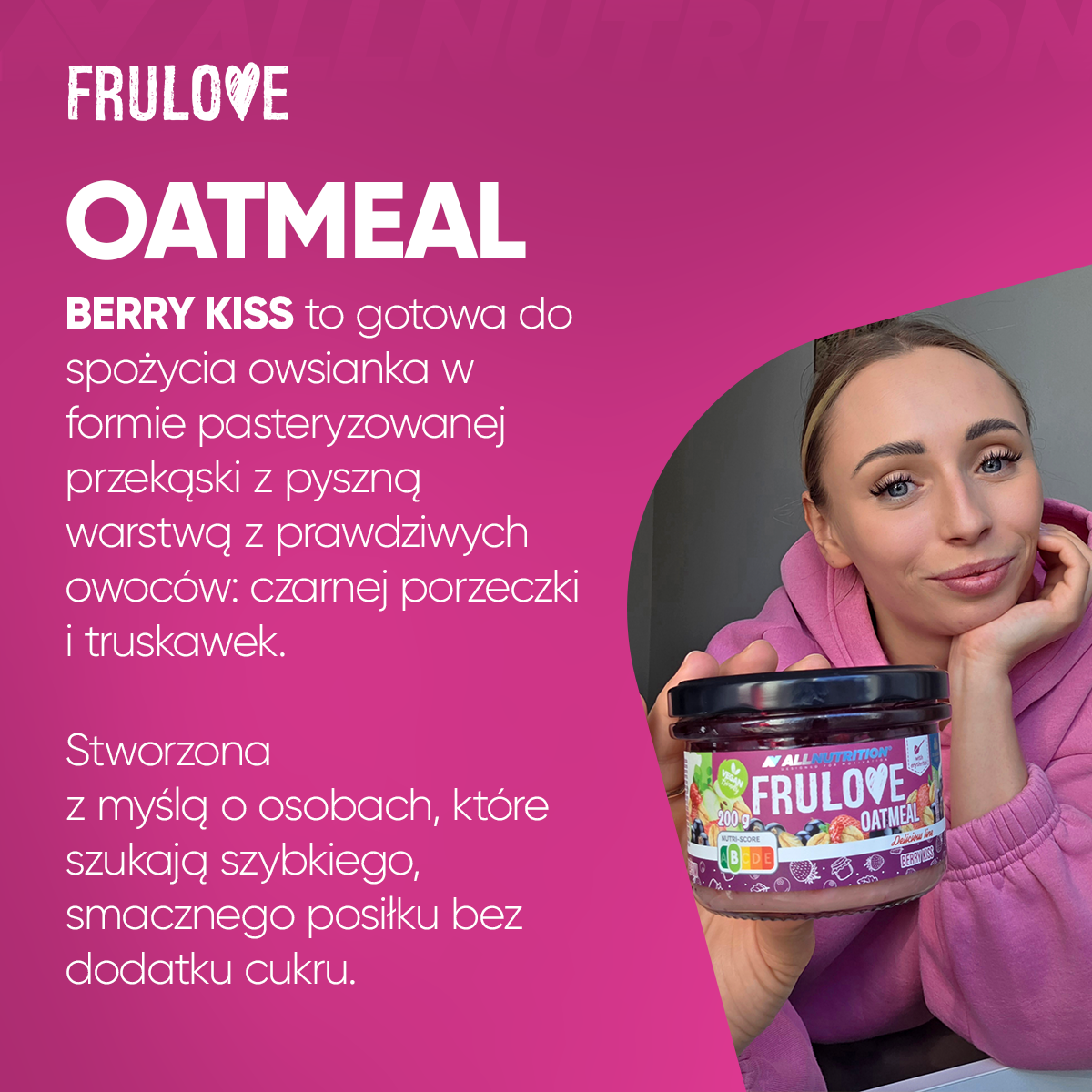 ALLNUTRITION FRULOVE OATMEAL BERRY KISS to gotowa do spożycia owsianka w formie pasteryzowanej przekąski z pyszną warstwą z prawdziwych owoców: czarnej porzeczki i truskawek. Stworzona z myślą o osobach, które szukają szybkiego, smacznego posiłku bez dodatku cukru. To idealne połączenie płatków owsianych i soczystych owoców, które możesz mieć zawsze przy sobie!