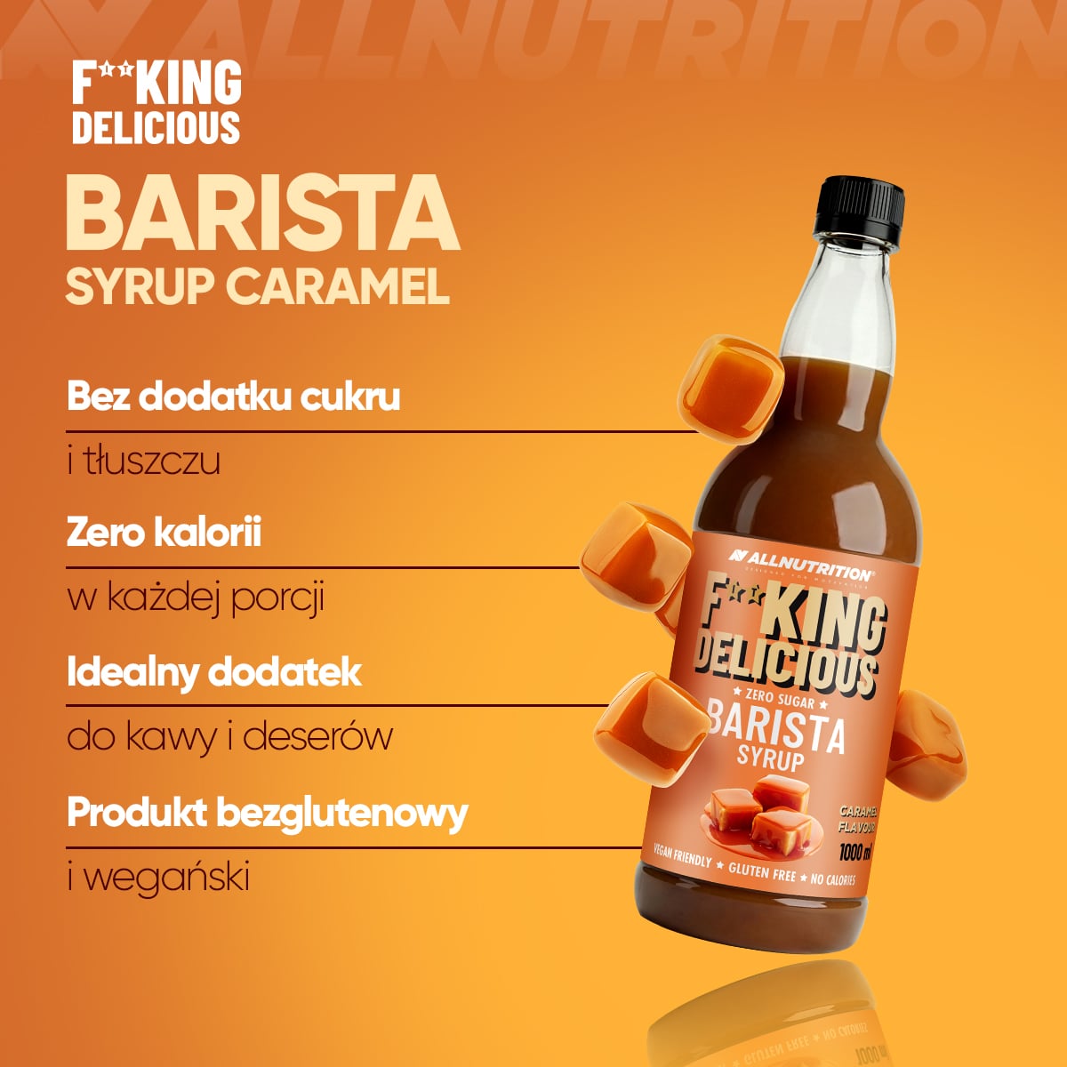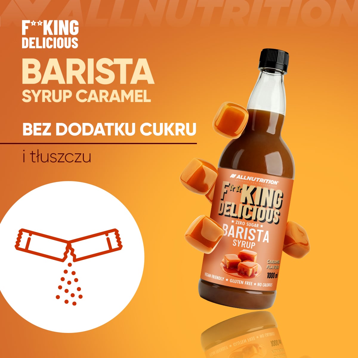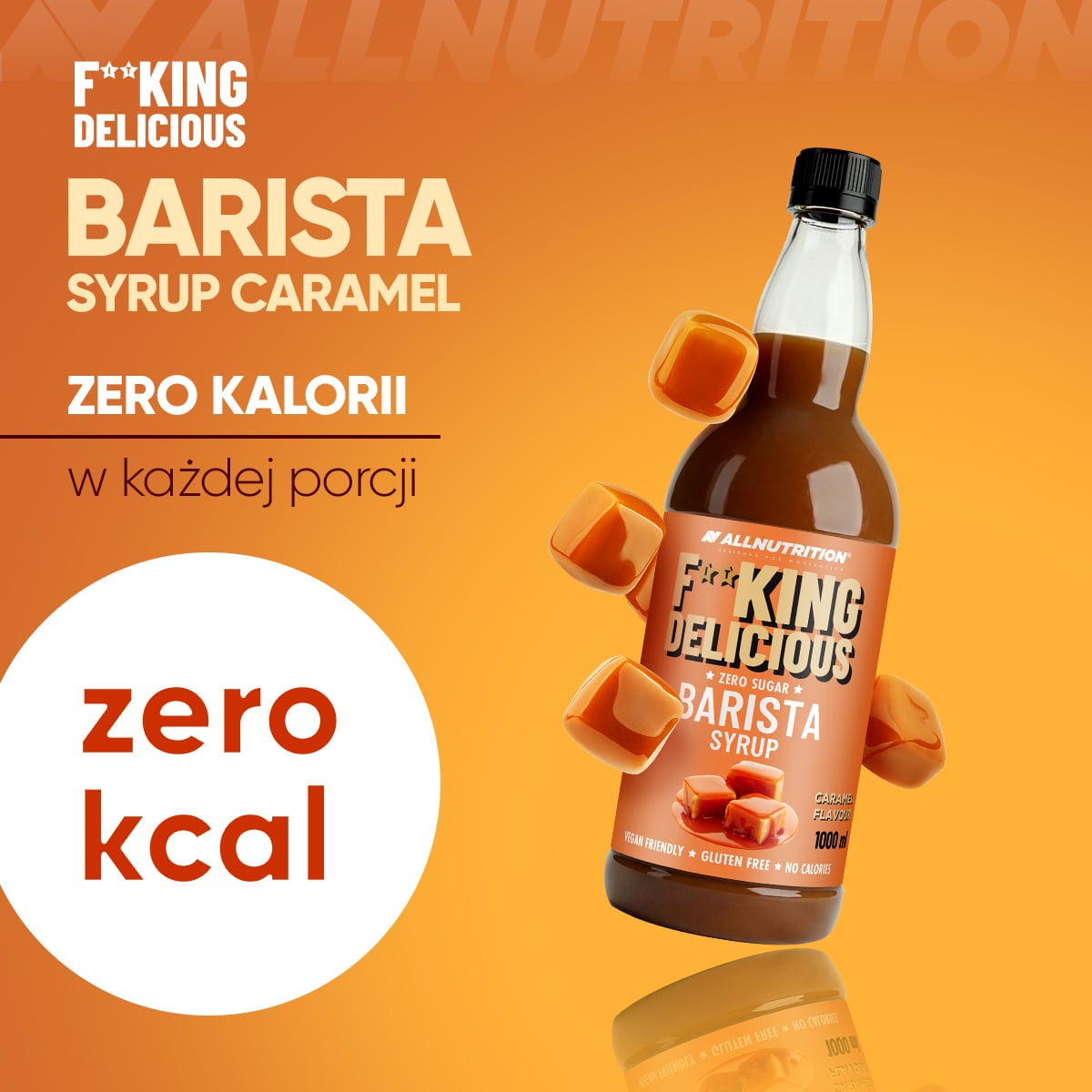 ALLNUTRITION FITKING DELICIOUS BARISTA SYRUP CARAMEL to aromatyzowany koncentrat o smaku karmelowym, który nie posiada wartości energetycznej oraz nie zawiera cukru i tłuszczu. Spełni najwyższe oczekiwania smakowe, nie obciążając przy tym diety. Idealny jako słodki dodatek do kawy, shake’a lub ulubionych deserów.