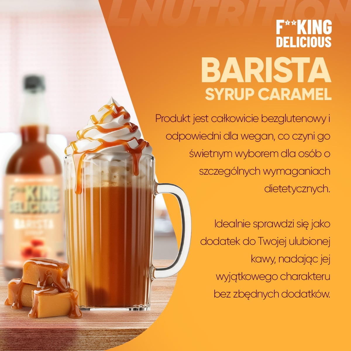 Aromatyzowany koncentrat bezcukrowy do napojów o smaku karmelowym. Zawiera substancje słodząca. Bez cukru. Nie posiada wartości energetycznej. Produkt pasteryzowany. Bezglutenowy. Odpowiedni dla wegan. Nie należy stosować w przypadku uczulenia (nadwrażliwości) na którykolwiek składnik produktu. Rozdzielanie jest procesem naturalnym i nie stanowi wady produktu. Przed użyciem wymieszać.