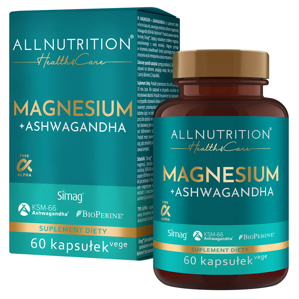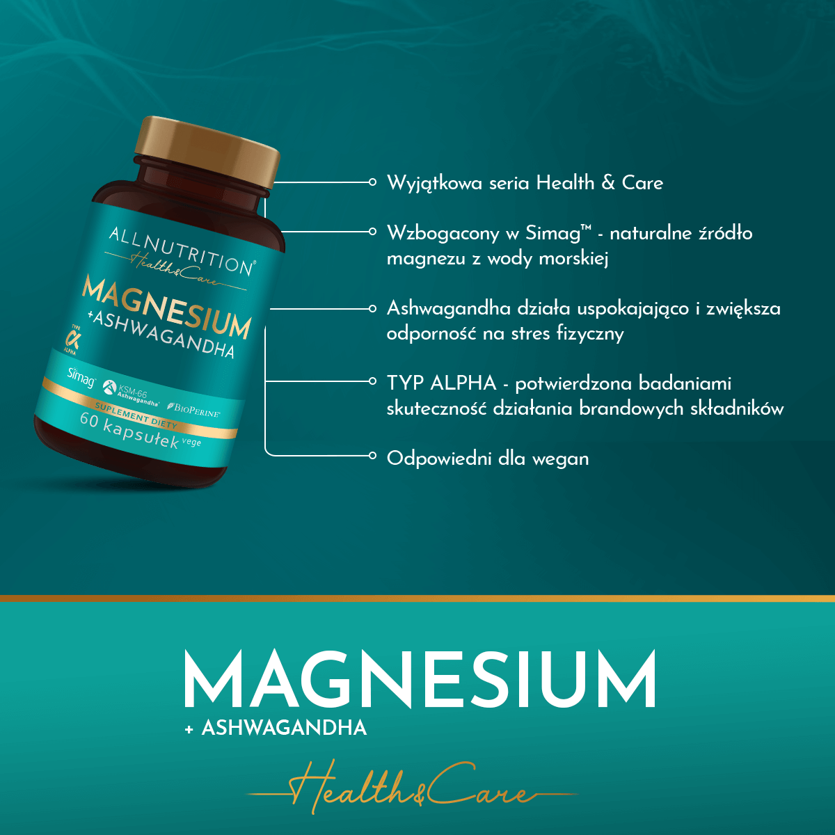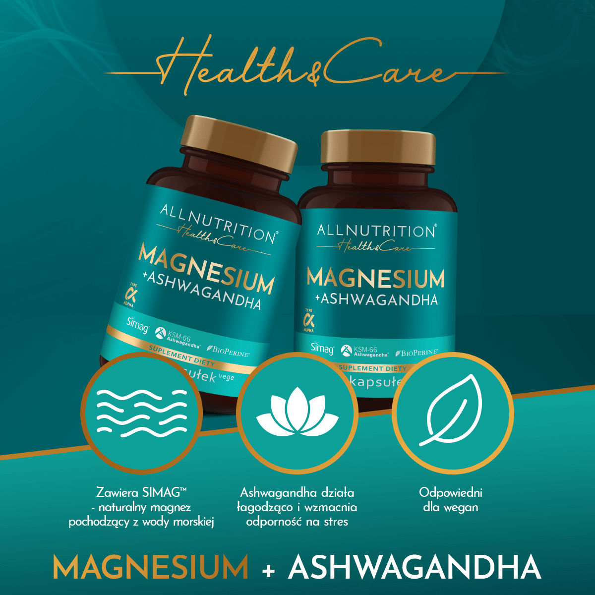 ALLNUTRITION HEALTH & CARE MAGNESIUM+ASHWAGANDHA to suplement diety z wyjątkowej serii Health & Care, która oferuje harmonijne połączenie brandowych składników, które są gwarantem niezrównanej jakości i skuteczności.