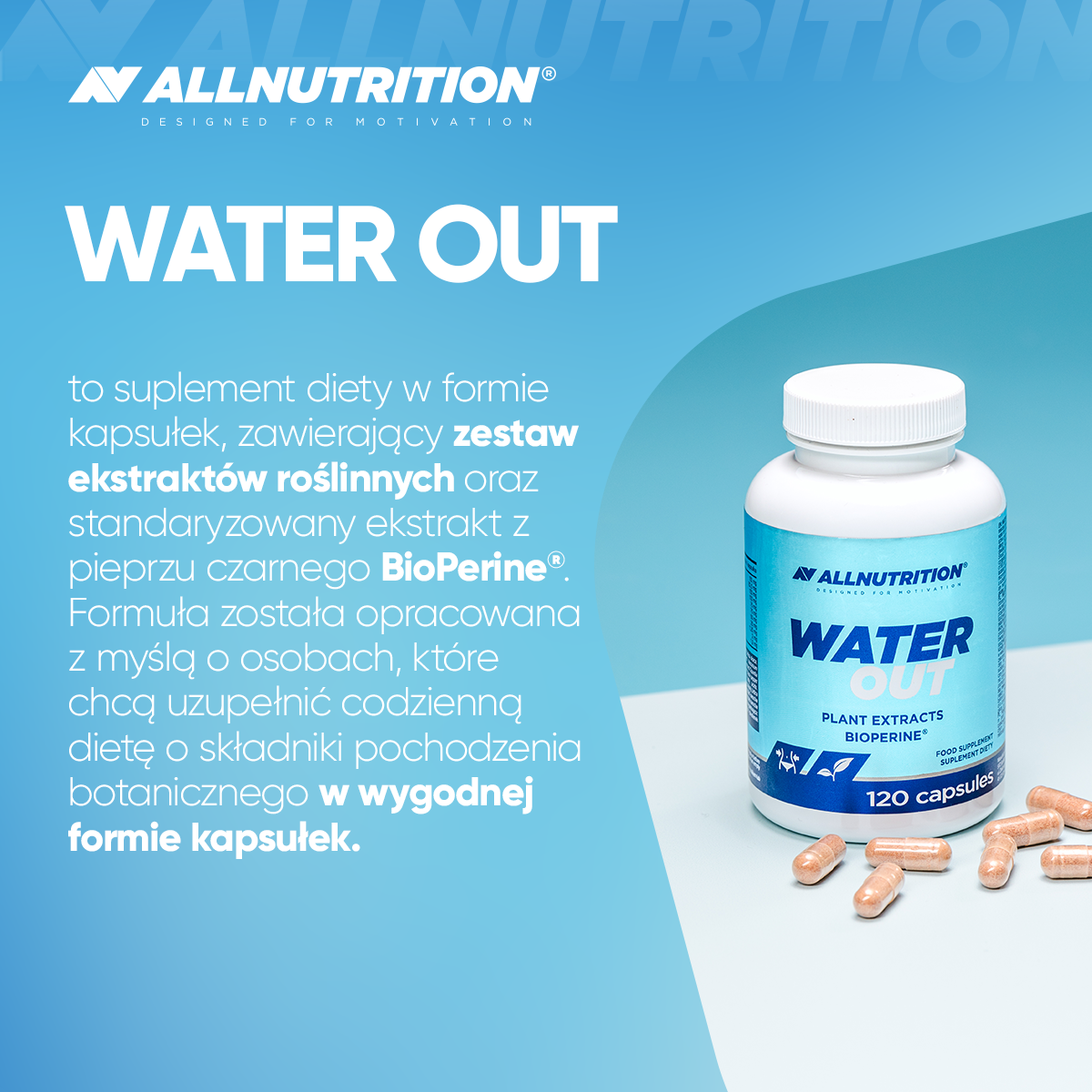 ALLNUTRITION WATER OUT to suplement diety w formie kapsułek, zawierający zestaw ekstraktów roślinnych oraz standaryzowany ekstrakt z pieprzu czarnego BioPerine®. Formuła została opracowana z myślą o osobach, które chcą uzupełnić codzienną dietę o składniki pochodzenia botanicznego w wygodnej formie kapsułek.