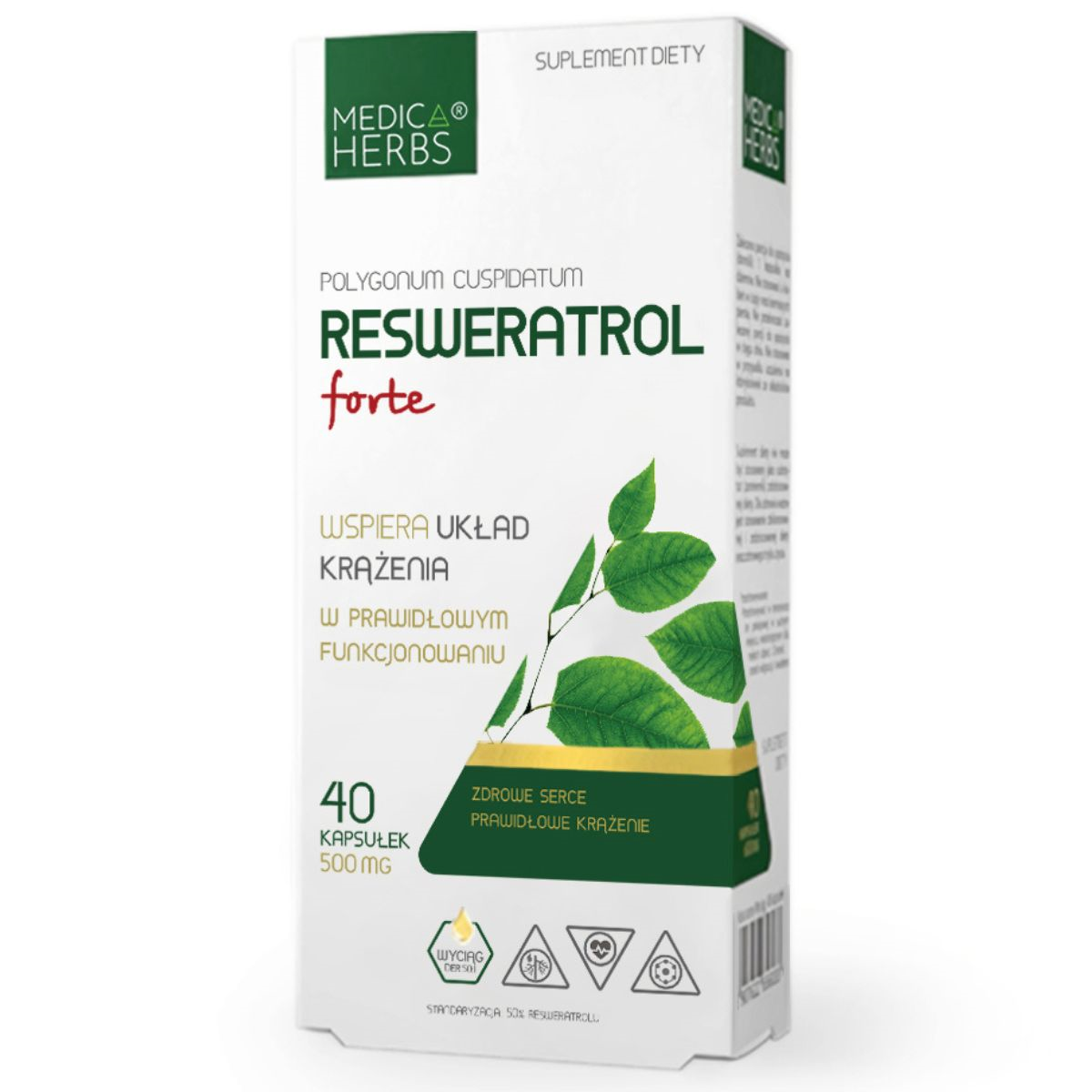 Medica Herbs Resweratrol Forte to suplement diety w kapsułkach, zawierający wysokoskoncentrowany ekstrakt z rdestowca japońskiego (Polygonum cuspidatum), będący naturalnym źródłem resweratrolu. Produkt został przygotowany z myślą o osobach, które poszukują roślinnych ekstraktów o standaryzowanej zawartości składników. Jedna kapsułka dostarcza aż 500 mg ekstraktu, w tym 250 mg czystego trans-resweratrolu. Preparat nie zawiera zbędnych dodatków technologicznych, barwników ani konserwantów.