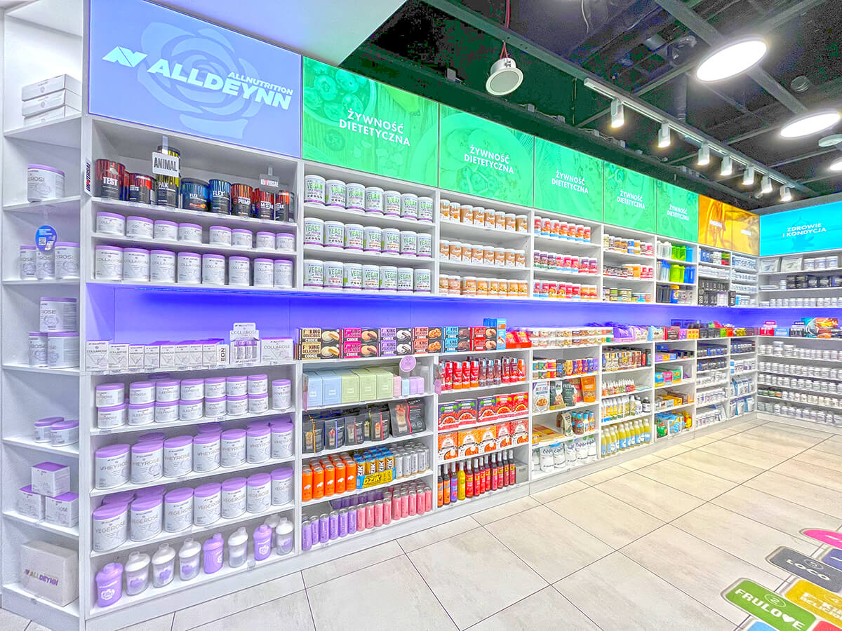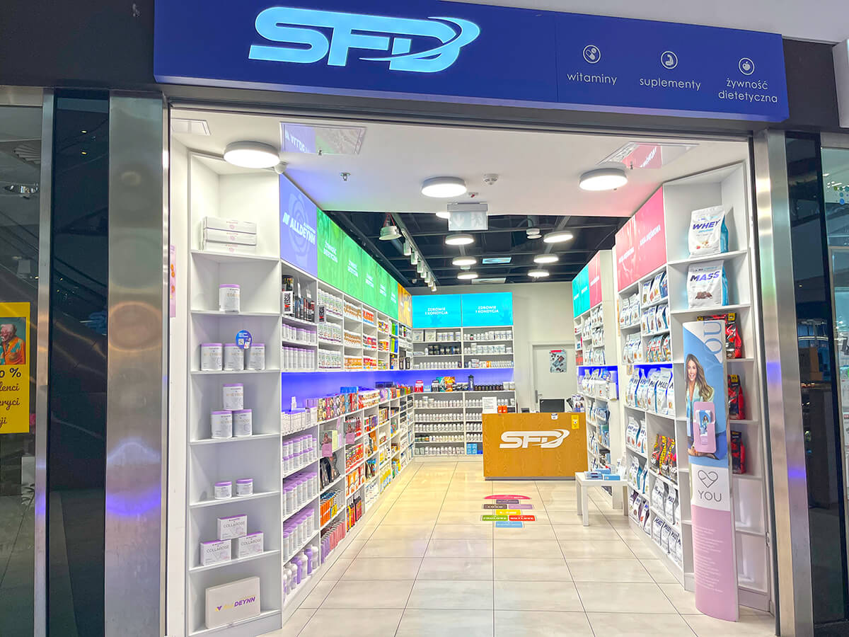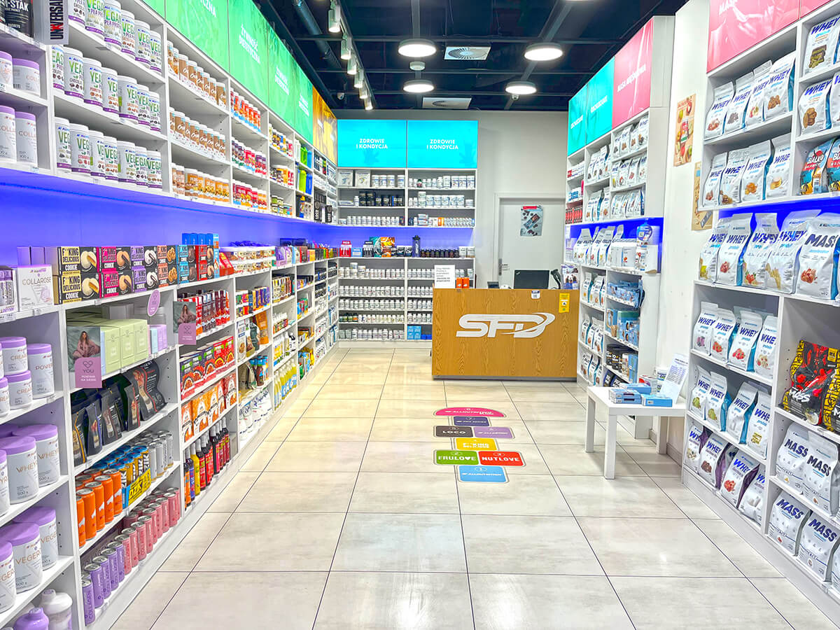 Sklep SFD mieści się w pawilonie na terenie parkingu Kaufland Fabryka Park w Katowicach. Zaopatrzony jest w szeroki wybór odżywek i suplementów.