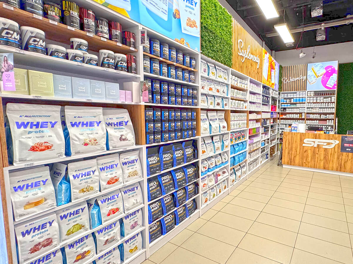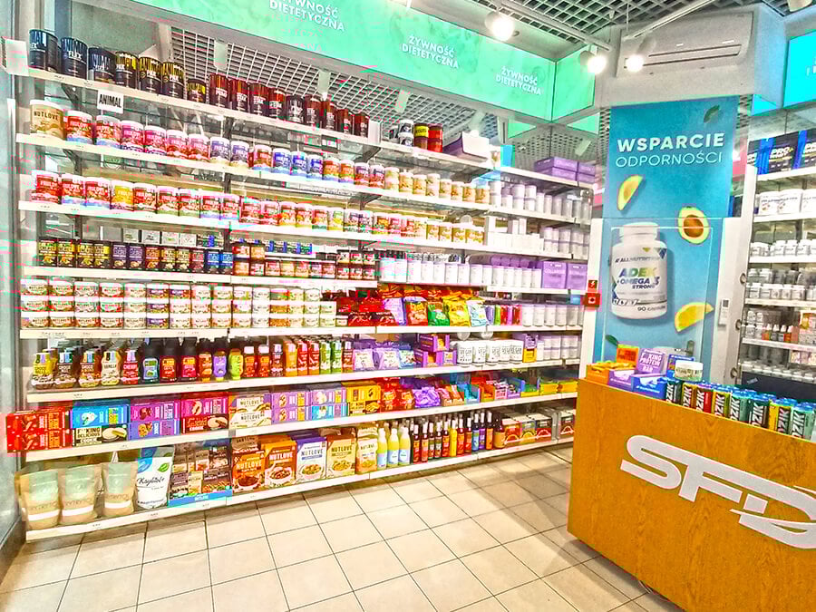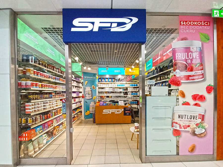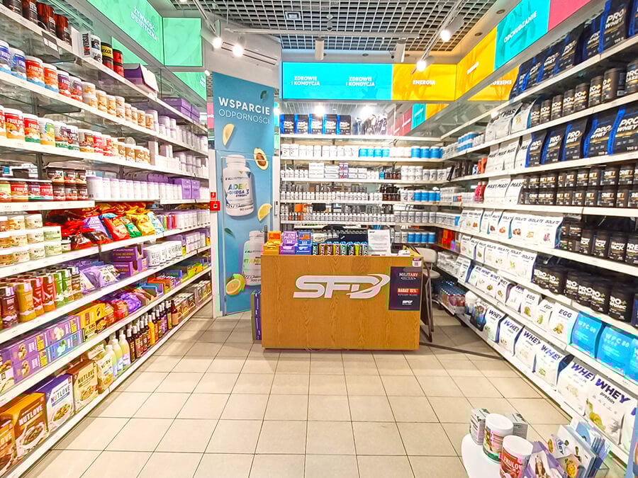Sklep SFD zaopatrzony jest w szeroki wybór odżywek i suplementów, a także witamin i żywności dietetycznej. Bezpłatny parking CH.
