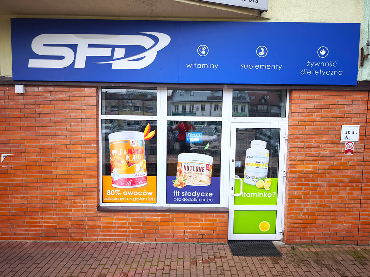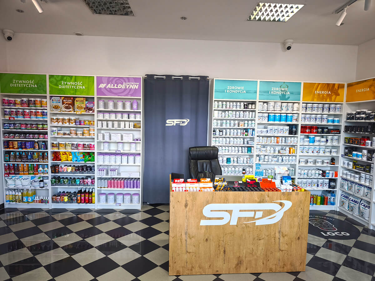 Sklep SFD zaopatrzony jest w szeroki wybór odżywek i suplementów, a także witamin i żywności dietetycznej. Duży parking przed sklepem.