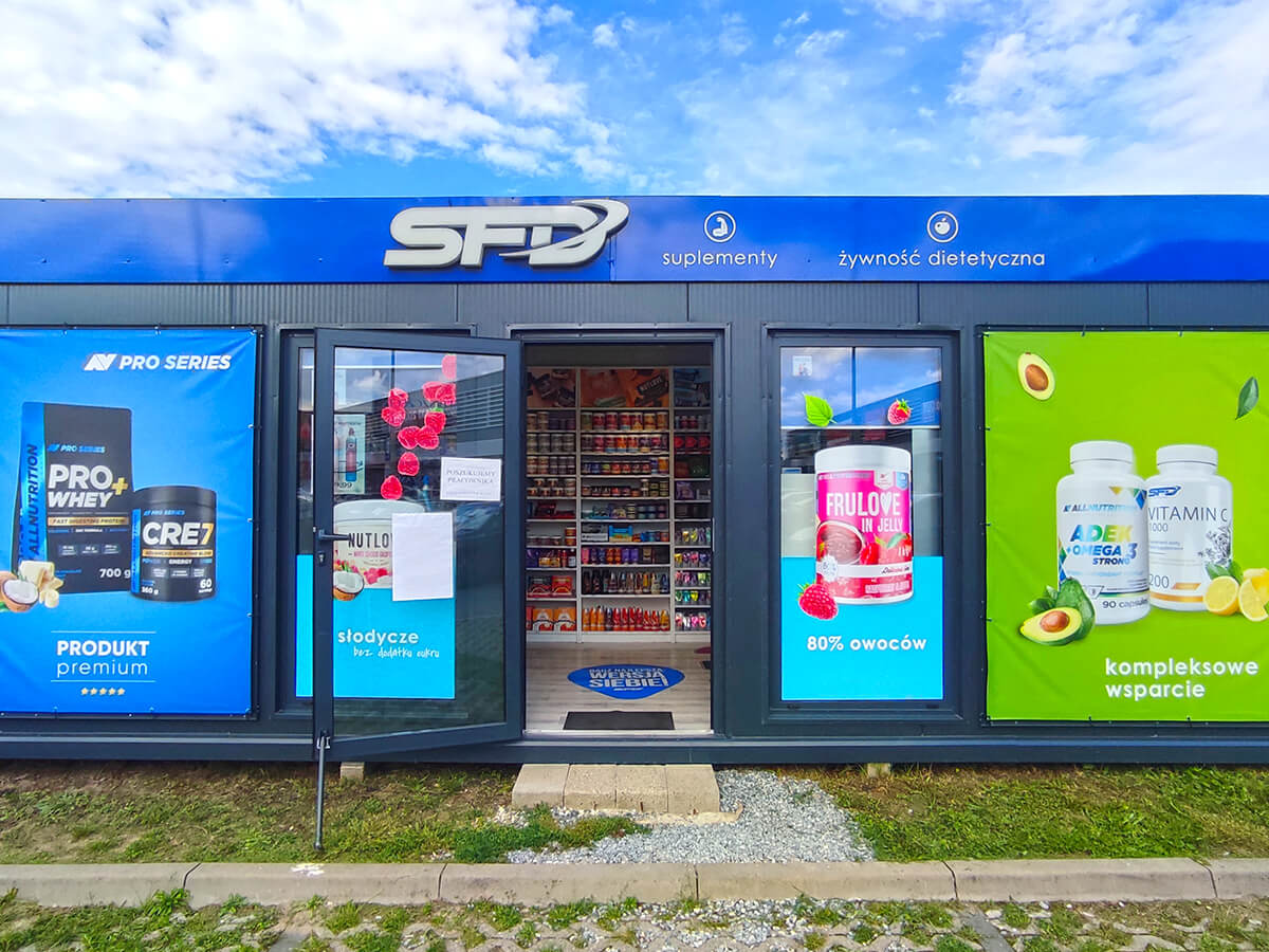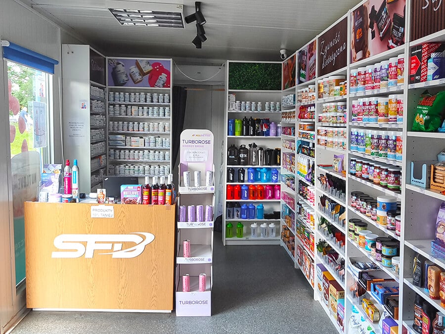 Sklep SFD zaopatrzony jest w szeroki wybór odżywek i suplementów, a także witamin i żywności dietetycznej po cenach internetowych. Bezpłatny parking na tereenie Retail Park Mieszka.