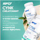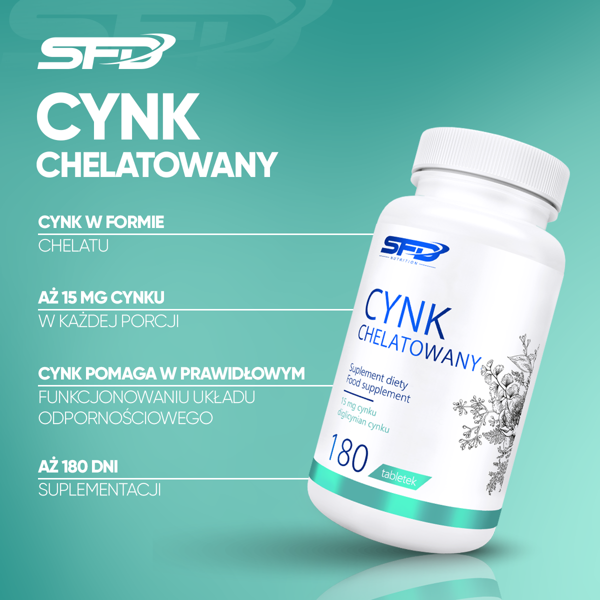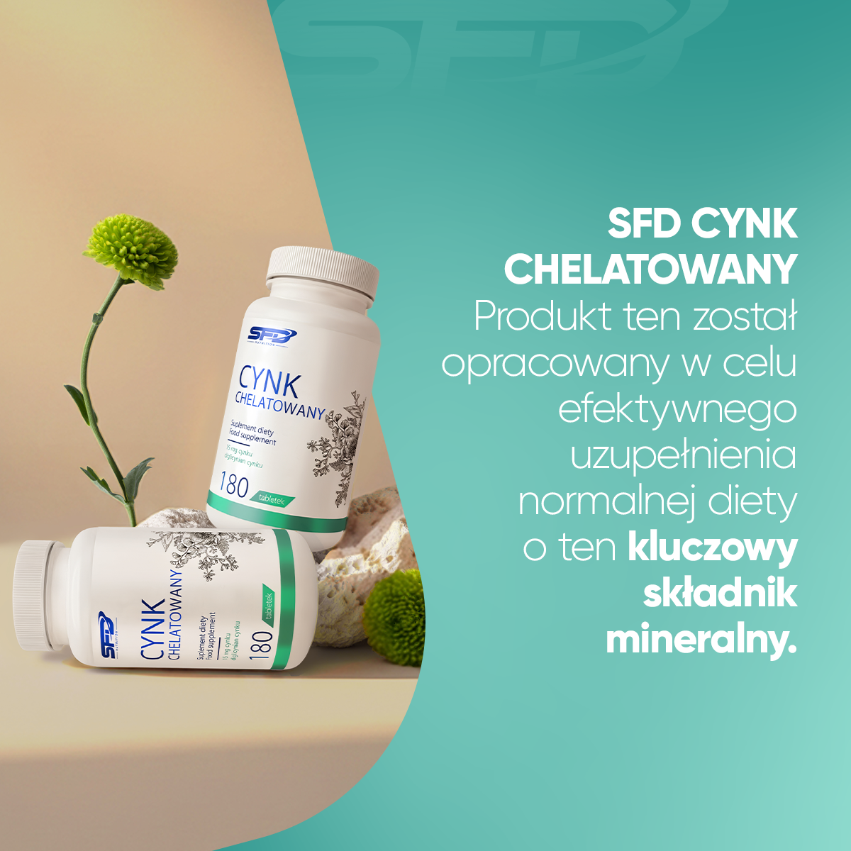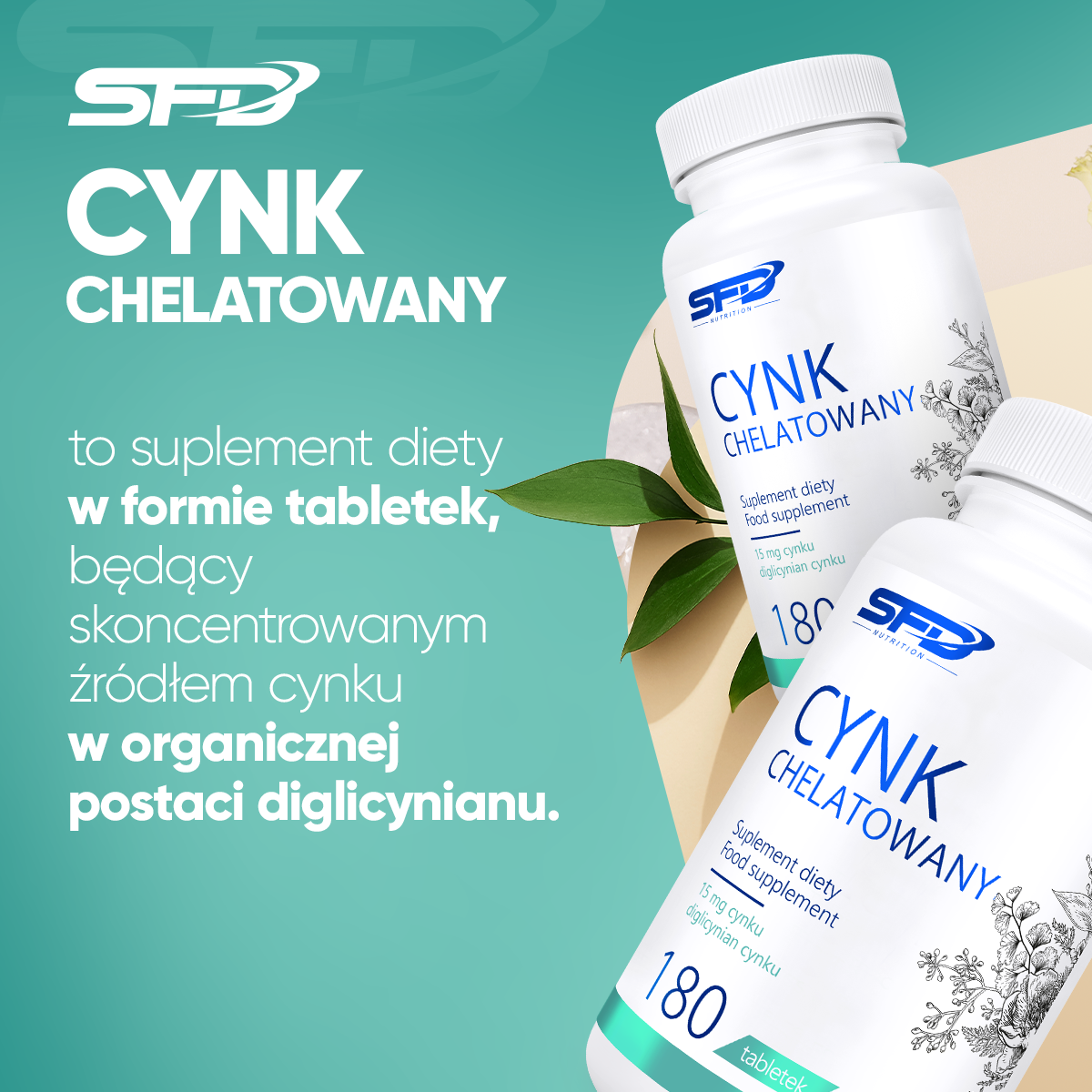 SFD CYNK CHELATOWANY to suplement diety w formie tabletek, będący skoncentrowanym źródłem cynku w organicznej postaci diglicynianu. Produkt ten został opracowany w celu efektywnego uzupełnienia normalnej diety o ten kluczowy składnik mineralny. Dzięki zastosowaniu formy chelatowej, pierwiastek ten charakteryzuje się doskonałą jakością i stabilnością.