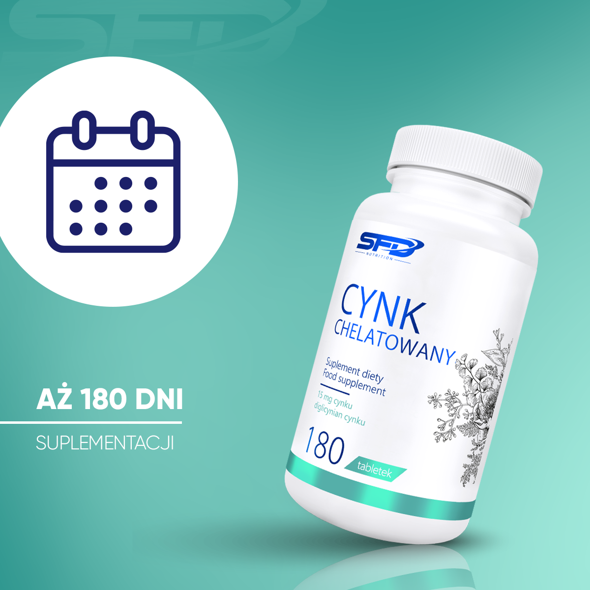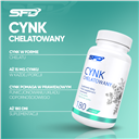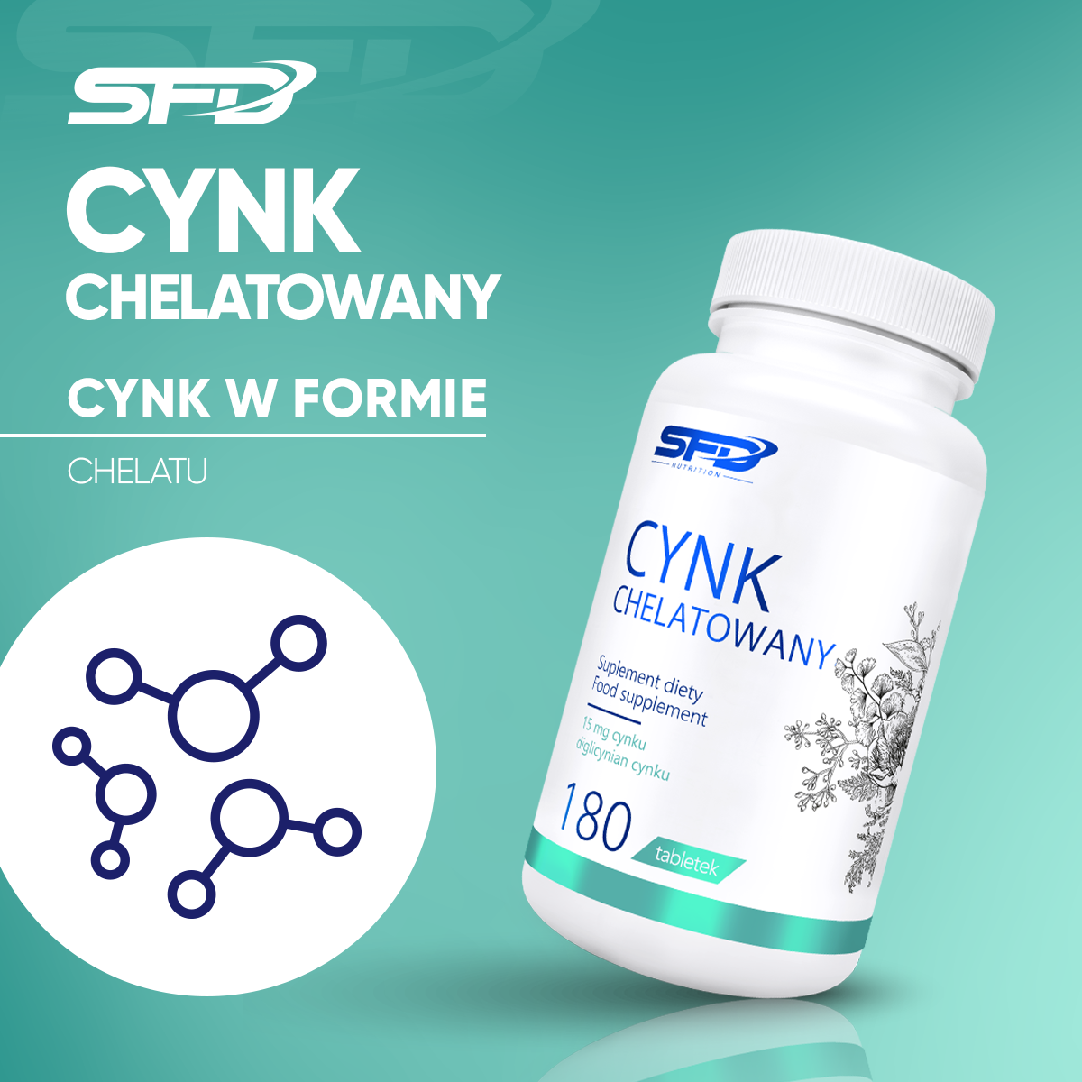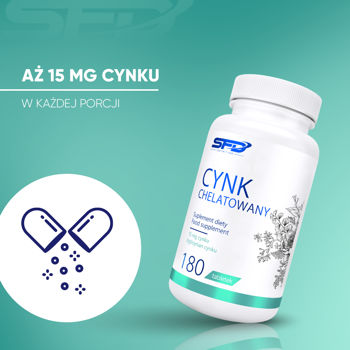 SFD CYNK CHELATOWANY to suplement diety w formie tabletek, będący skoncentrowanym źródłem cynku w organicznej postaci diglicynianu. Produkt ten został opracowany w celu efektywnego uzupełnienia normalnej diety o ten kluczowy składnik mineralny. Dzięki zastosowaniu formy chelatowej, pierwiastek ten charakteryzuje się doskonałą jakością i stabilnością.