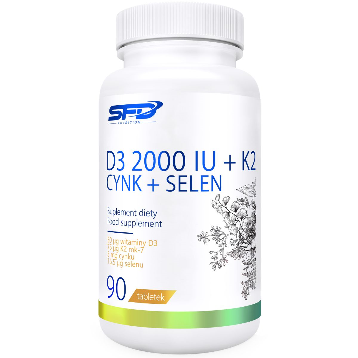 SFD D3 2000+K2+CYNK+SELEN to suplement diety w formie tabletek łączący witaminę D3, witaminę K2 MK-7 z natto, cynk i selen w jednej, wygodnej tabletce. Cztery składniki aktywne i 90 dni suplementacji w jednym opakowaniu.